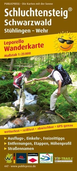 Schluchtensteig-Leporello mit 17 Teilkarten 1:25.000 und eingezeichneter Routenführung, Tipps zu Wanderhotels, Gasthäusern, Ausflugszielen und Touristinfos. Die Karte ist wetterfest, reissfest, abwischbar, GPS-genau.